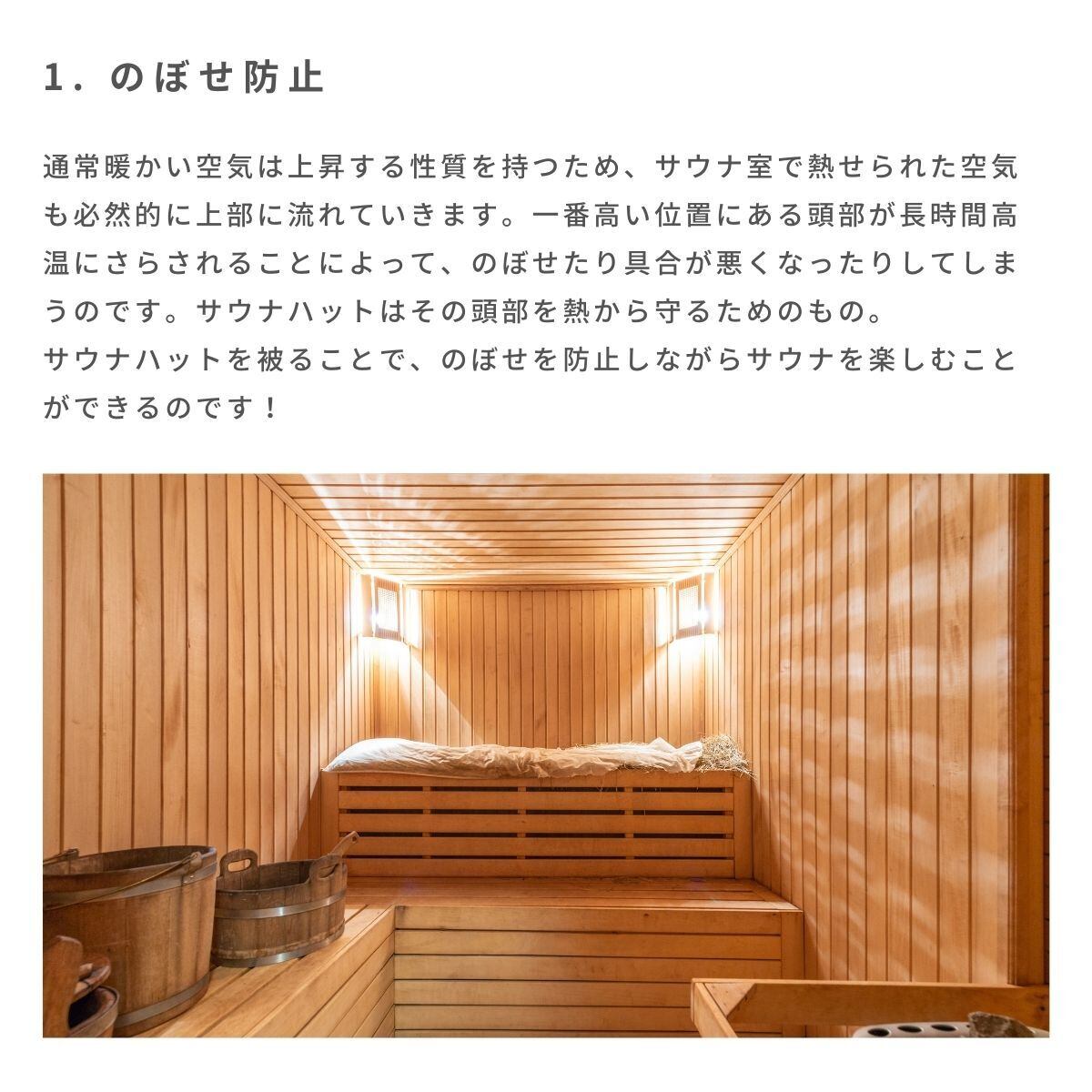 通常暖かい空気は上昇する性質を持つため、サウナ室で熱せられた空気も必然的に上部に流れていきます。一番高い位置にある頭部が長時間高温にさらされることによって、のぼせたり具合が悪くなったりしてしまうのです。サウナハットはその頭部を熱から守るためのもの。